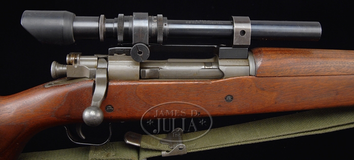 *REMINGTON MODEL 1903 A4 SNIPER RIFLE. SN 3409914. Cal. 30. 24″ bbl. This rifle is equipped with the very rare M73 B2 telescope made by O.P.L. in France. Rifles with this experimental scope are extremely rare and desirable. Rifle comes with a 1907 Springfield bayonet. PROVENANCE: Stern Collection. CONDITION: Bbl receiver and bolt assembly show virtually no use. There are some minor rack marks on the bbl near the muzzle. Blued bands show better than 98% of the orig Remington blued finish with the trigger rguard/floorplate assembly showing better than 90% with any loss being from the buckle on the sling. Upper hand guard shows no abuse at all retaining better than 99% of its orig finish. The “C” type stock shows full Remington sub-inspectors as well as RA/cross cannons and “FJA” in box. Circle P firing proof is very prominent and stock is near new. Scope mount and base are all blued finished and in excellent condition. Rifle is also equipped with a course checkered national match type buttplate that shows near new. In this catalogers opinion this is one of the rarest experimental sniper systems that could be obtained. Mechanics are crisp and the bore is near mint four groove. Bayonet is in good condition with speckling throughout and cloth over scabbard is in very good condition with very little deterioration and only the slightest bit of scoffing. 4-34033 BK12 (3,500-5,000)
