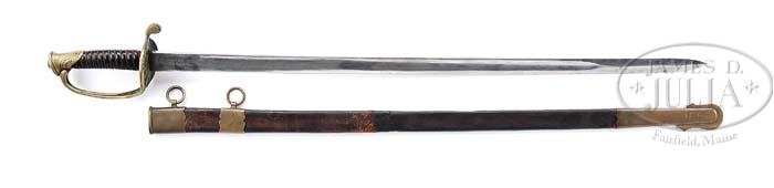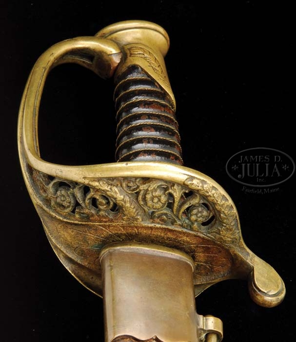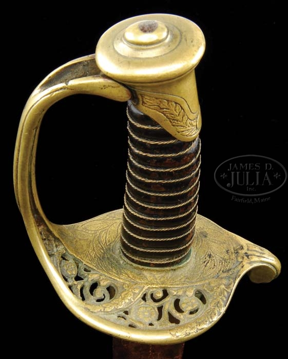 LEECH & RIGDON FOOT OFFICER’S SWORD. You are bidding on a classic Leech & Rigdon foot officer’s sword with polished wood grip, a bright nearly new blade, and a scabbard with classic Leech & Rigdon scalloped mounts. Hilt is the 1850 style decorated with classic Leech & Rigdon style with multi-petaled flower on bottom of hilt and an etched wreath of leaves which end in the typical pierced rose pattern. Polished wood and black painted grips have only been seen on a few Leech & Rigdon products before and all seem to have had extra highly polished blades, as does this one. Bill’s notes indicate this was used at the battle of Perryville, KY. PROVENANCE: Bill Osborn Collection, Ex Fred Stayton Collection. CONDITION: 31-1/4″ straight un-stopped fuller blade is bright/gray with scattered staining and pitting. Painted grip surface is chipped and worn in high areas, as can be seen in photo. Brass surfaces of hilt, scabbard mounts have patina and scattered scratches and nicks. Leather body of scabbard has repair between drag and middle mount. Scabbard appears to be broken and repaired from pieces of two different scabbards. 4-38947 JS10 (8,000-12,000)
