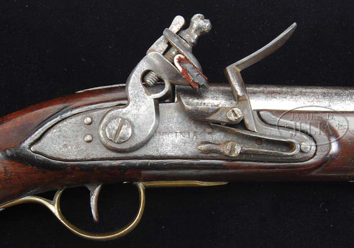 1812 2ND MODEL VIRGINIA PISTOL. SN NSN. Cal. 62. 10-1/8″ unmarked rnd iron bbl. Lock is marked underneath the pan “VIRGINIA”, reading vertically behind the cock remnants of “1814” (barely visible). Inside the lock is a sunken “W” and is original flintlock. Furniture consists of a brass sideplate, trigger guard, butt cap, ramrod pipe and forend band. Iron ramrod appears to be original, however the swivel mechanism is lacking. Walnut stock is marked in script “JJ” opposite the lock. PROVENANCE: Charles Radcliffe Collection. CONDITION: Bbl is in very good condition with very little evidence of pitting while the lock mechanism has areas of light to medium pitting concentrated around the area of the date. Brass furniture is a nice mellow color. Stock is in very good condition, good edges and minimal handling marks making this a very good example of a Virginia Manufactory pistol. 4-39582 PAS49 (6,000-8,000)