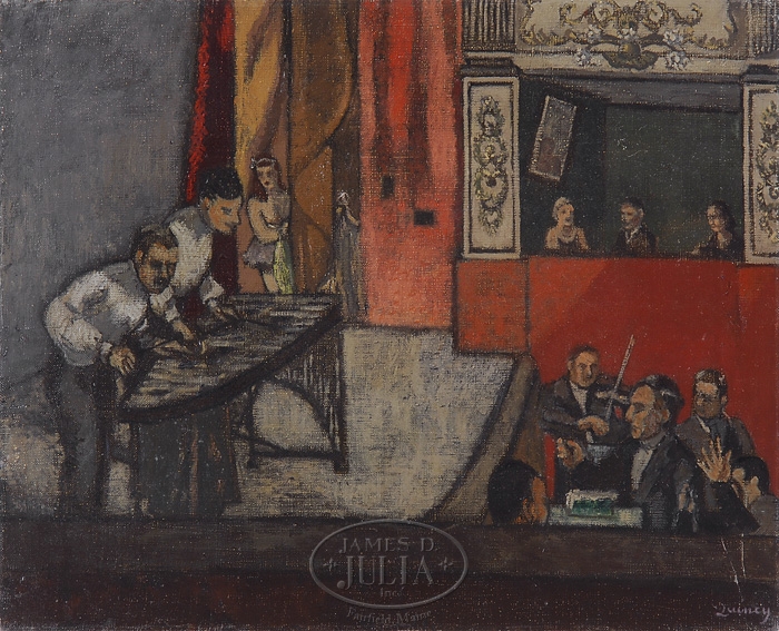 EDMUND QUINCY (American, 1903-1997) “VAUDEVILLE B. SQ. THEATER, BOSTON”. Oil on canvas interior theater scene shows two men playing xylophone on stage with musicians in the pit, onlookers in box and a dancer looking out from the curtain. Signed “Quincy” bottom right and titled on reverse of stretcher. Unframed. SIZE: 18” x 22”. CONDITION: Very good. 9-96646 (800-1,200)