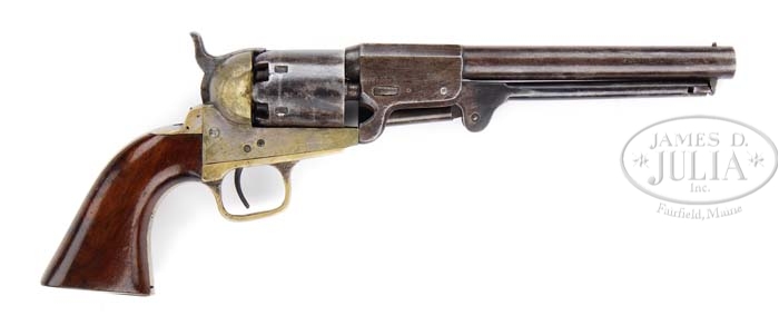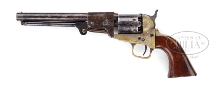 GRISWOLD REVOLVER. SN 3581. Cal. 37. This Griswold is amongst the rarest of the rare, having been assembled from parts and finished by ex-Griswold workers after the factory was fired by Union cavalry. There are only 2 other such other guns known and not as nice as this one. This is one of the highest conditioned Griswold’s known and is highly prized by Mr. Edmunds. The above handgun was completely disassembled and thoroughly examined by Mr. Fred Edmunds, and found to be in excellent original condition. The highest known serial number for the Griswold revolver is 3606, and there are some slight variations which occur near the end of production, such as the gun at hand, and several others which will be described. One unusual feature of the gun at hand is that the frame, backstrap and triggerguard have been silverplated: unusual indeed for a Griswold, but Griswolds numbers 3544 and 3606, and one other specimen observed, also showed traces of silver plating of the same parts! After its cylinder was stamped with the serial #3581, the gun was highly polished and given a fine blue finish: much finer than earlier Griswolds! Finally, the gun was furnished with high quality walnut grips which show nearly all of their orig varnish! The face of the hammer, which is orig, is not milled out to accommodate the safety pins on the rear of the cylinder, but rather, shows a raised “VI’ shape, instead. The other three pistols observed by the undersigned had the same hammer configuration. With the mortality rate so high on Confederate revolvers, and production numbers so low, it would be safe to hazard an opinion that near the end of production, some few Griswolds were indeed highly finished and polished, and were fitted with deluxe varnished walnut grips:this after closely examining four like-specimens. Other markings found on the gun at hand are the usual cryptic marks and numbers found on regular specimens, as follows: CYLINDER: serial number was applied before blueing, so SN 3581, while very evident, cryptic “2” stamped at muzzle end, metal clearly visible and correct. Polishing and appears light: twist to right. BARREL LUG: cryptic mark “2”, at bottom inside. LOADING LEVER: “I’ stamped on top flat. TRIGGERGUARD: cryptic mark “2”, and “VI”. FRAME: Cryptic “RR”, on right inside of standing breech: “VI” on bottom of frame. GRIP: pencilled-in “2”. BACKSTRAP : “21” stamped on right inside: “XVX” stamped on right-side butt: cryptic “2” stamped lower left corner inside backstrap. HAMMER: cryptic “2” stamped. RATCHET ARM: stamped “1”: spring missing. Many different cryptic marks are to be found on Griswold revolver parts: they are thought to be inspection or assembly marks. There are Roman-type configurations as well as regular numbers regarded as secondary marks. If there is one abiding generality which can be made about Griswold & Gunnison revolvers, it is that while there is great similarity of design and function among them, each piece has its own individuality and personality, and parts will not interchange: this is the reason for all the markings. Griswolds were made with the help of slave labor, and there was total hand-fitting, making each different to some extent. Sometimes it is this relatively crude manufacturing method which makes counterfeiting easier to detect! In conclusion, the specimen described herein is original in all respects and its excellent condition make it a very desirable collector’s specimen. Nearly every Confederate collector is familiar with the brass-framed revolver known as the Griswold & Gunnison. Most accept the premise that there are two distinct models of the Griswold: the first having a rounded barrel housing; the second, an octagonal housing. Some recent research involving some high serial numbered Griswolds, reveals what appears to be at the very least, a variation of the second model! This variant second model crops out in Griswolds numbered #3544, #3581, #358_, and #3606 (the highest serial number known). All four of the above numbered specimens have been disassembled and examined and compared with other “regular” Griswolds. The four high-numbered models differed in the following respects: 1) Their brass frames, backstraps and triggerguards had all been silver plated, with gun # 3581 still showing 25% silver remaining: the others had many traces of silver plating on the same parts. 2) The faces of the hammers were not milled out to accommodate cylinder safety pins, but instead, have raised flat protrusions in the form of a “V”. There was no knurling on the hammers. 3) All grips were of high quality walnut and were originally varnished, with gun # 3581 retaining 95% original varnish. 4) On all four specimens examined, there seems to have been an effort to create a deluxe finish. Gun # 3581 was first stamped on the cylinder, then highly polished before blueing: it still retains some 70% of its original finish! 5) All four guns show various cryptic marks, peculiar to Griswolds. In his fine reference work, “CONFEDERATE REVOLVERS”, author William Gary observes that after the Griswold pistol factory was destroyed by Union cavalry in November of 1864, work ceased at that site; but as deliveries to the Confederacy continued to April of 1865, production could have resumed elsewhere, with uncompleted guns and parts being removed, taken elsewhere and finished. This observation may be further enhanced by the fact that gun # 3581 has no further serial number stampings than on the cylinder. We firmly believes that Mr. Gary is correct in his observation, and that it just might be possible that these four high numbered Griswolds are among those which were completed after the pistol factory was destroyed! An excellent topic for further research! PROVENANCE: Fred Edmunds, E. Berkly Bowie, and Al Kelley CONDITION: As noted above. 4-38130 JS37 (30,000-35,000)