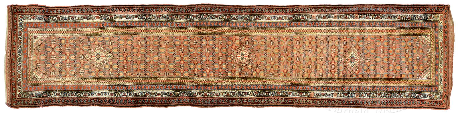 HAMADAN RUNNER. Second quarter 20th century, Central Persia. In earth tones overall; three small aligned medallions on a pale rose ground with dense rows of polychrome lotus blossoms and flower heads within multiple floral guard borders. SIZE: 14′ x 3’2″. PROVENANCE: From a fine Maine and New York private collection. CONDITION: With good color and pile. Generally good. 9-29902 (600-800)