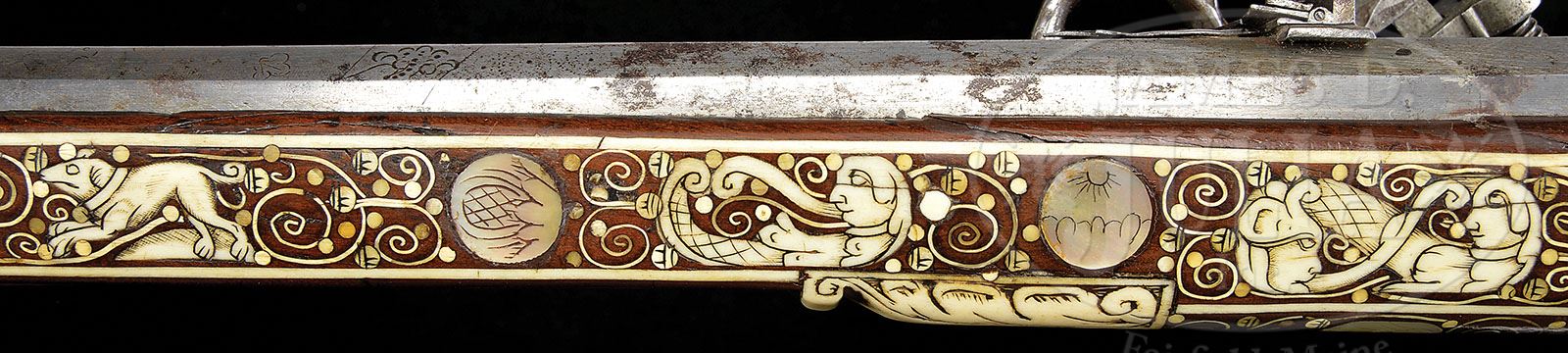ELABORATELY INLAID SILESIAN WHEEL LOCK RIFFLE, CIRCA 1610. SN NSN. Silesian wheel lock rifles are much rarer than Silesian wheel lock tschinkes. This rifle is inlaid in the characteristic Silesian style with both white stag horn and mother of pearl in classic Eastern European fashion with stags, dogs, rabbits, squirrels, angels and an eagle. Cheekpiece has two dog-like sphinxes beneath two winged beasts. Sideplate inlay is of a sphinx. Inlay on this rifle is unusually elaborate and generally crisp condition. Lock has rudimentary engraving of birds and doubtless was once silvered, though no traces remain. Hammer engraved with a dog. Top jaw is original and pierced. Oct bbl engraved throughout its length and was once doubtless silvered as well. Three leaf rear sight and steel blade front sight. PROVENANCE: Ron Peterson, Albuquerque, NM. Collection of Dr. Douglas Sirkin. CONDITION: Metal is cleaned but not worn. Engraving slightly worn but fairly crisp. Trigger guard still retains traces of its original silver. Inlay is overall in good condition. Scrimshaw having most of its original black ink. A few minor replacements of pearl along the forend and on the butt, but mostly all original. 4-49778 (20,000-35,000)