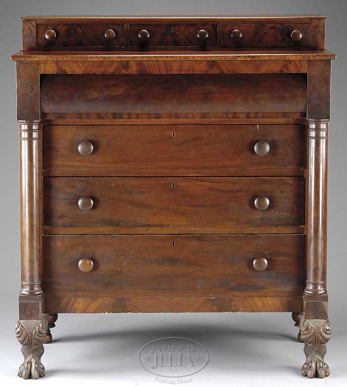 NEW ENGLAND CLASSICAL MAHOGANY CHEST OF DRAWERS. 2nd quarter 19th century. The rectangular case surmounted by a deck top fitted with three aligned drawers, the centermost affixed with paper label of the retailer: “ALBERT WINE & CO./Antique furniture/1100-1104 Broad Street,/Providence, R.I.” The case fitted with a bolection curved upper drawer over three graduated long drawers over three recessed graduated long drawers flanked by freestanding columns, the case sides with recessed panels, raised on acanthus-carved hairy claw frontal feet, the rear legs with turned turnip feet. SIZE: 48″ h. x 43-1/2″ w. x 21″ d. CONDITION: Chest of drawers retains original wooden handles and finish. Very good overall. 9-99228 (800-1,200)