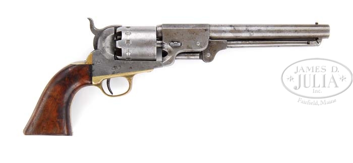 RARE AUGUSTA, GEORGIA MARKED RIDGON & ANSLEY REVOLVER. All serial numbers on this piece are stamped with the correct small number dies, with individually stamped numbers. It is also to be noted that the number “1” is a broken die which became broken at pistol #1237, continuing to be used through the small-die run to R&A pistol #1900, or thereabouts. This gun has cryptic “J” stamped on the bottom front of the triggerbow and all parts are serial numbered #1546 that are normally serial numbered including barrel housing, loading arm, latch, wedge, frame, cylinder, backstrap and triggerguard. Rigdon & Ansley #1546, with its “Augusta Ga” barrel address, and its excellent condition, make it an outstanding prize for the Confederate collector. Of the 18 known revolvers with this barrel address this is by far among the best 2 or 3 examples known. Sometime in late November or early December of 1862, the firm of Leech & Rigdon, then located in Columbus, Mississippi, contracted with the Confederate Government to manufacture 1500 percussion revolvers of the Colt patent design. With Union troops threatening the Columbus area, Leech & Rigdon moved its operation (its third move) to Greensboro, Georgia, where they began turning out revolvers in March of 1863. Approximately 1000 revolvers were produced at Greensboro, before it was again necessary to move because of Yankee pressure in the area. The Leech & Rigdon partnership split up in January of 1864, and Rigdon took all the gun-making machinery with him, moved to Augusta, Georgia (the fourth and last move) forming a new partnership with Jesse Ansley. Rigdon & Ansley assumed the responsibility of completing the original Leech & Rigdon contract, by manufacturing the remaining 500 revolvers of that model, then going on with a new contract to furnish 1500 Rigdon & Ansley revolvers. While the Rigdon & Ansley revolvers were practically identical in design to the Leech & Rigdons, there were some changes made which were considered improvements at the time. The most obvious change was the addition of six (6) more cylinder stops in the Rigdon & Ansley, and the omission of the locking pins on the rear shoulders of the cylinder. This was thought to be a safety improvement in that it allowed the cylinder to be locked in place with the hammer resting between the percussion nipples. An additional change was the milling-out of a groove in the recoil shield, which now came to be called a “cap release groove”, which allowed spent percussion caps an easier exit from the frame, so that they were expelled via the groove at the right top side of the recoil shields as the cylinder rotated to the right in the firing and recocking procedure, after each round was fired. This “cap release groove” is not found on R&A #1546, for the reason that there were extra Leech & Rigdon parts which Rigdon had used in undertaking to complete the original contract for 1500 revolvers, and the Leech & Pigdon frame used here was one of those ‘extra’ parts. The final change from the Leech & Rigdon, was the employment of a ‘Colt-type’ loading lever latching assembly, rather than the Leech & Rigdon’s ball-type catch and later, ball-and-pin-type catch. Rigdon & Ansley, the piece at hand does employ the “Colt-type’ latch, which is serial-numbered. PROVENANCE: Fred Edmunds Collection. CONDITION: As stated above. 4-38126 JS34 (40,000-50,000)