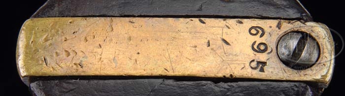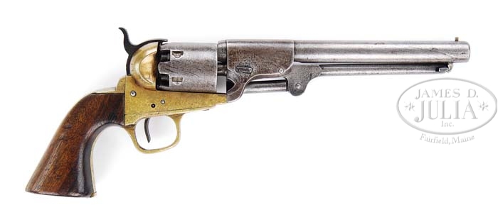 FIRST MODEL GRISWOLD. SN 695. Cal. 36. You are bidding on a fine conditioned first model Griswold that was probably captured by Cap. Frank Wells of the 13th Connecticut Infantry. There is an affidavit accompanying this gun that states that Frank Wells was Provost Marshal during the Civil War in New Orleans and served in the 13th Connecticut and passed this gun down through his family where it finally ended up in Fred Edmunds Confederate States Armory and Museum. This gun was made Griswoldville, Ga. late in 1862 or early 1863. Its round bbl housing identifies it as a first model. This fine specimen is numbered like other known specimens. SN 695 is found on bbl housing, frame, triggerguard, cylinder and backstrap. Secondary number “95” is found on wedge, loading arm, trigger, hammer and inked inside stocks. A cryptic “E” is found on frame, bottom of bbl, backstrap and triggerguard. Mr. Edmund’s notes states: “Griswold & Gunnison revolver #695 is probably one of the finest first models of this rare Confederate handgun. It is thought that while a total number of 3606 handguns were made by Griswold, only the first 1,500 had the round barrel housing, thus being designated first models. The gun at hand is completely original in every respect, and is a most desirable Confederate artifact.” PROVENANCE: Fred Edmunds Collection. CONDITION: As noted above. 4-38128 JS40 (27,500-32,000)