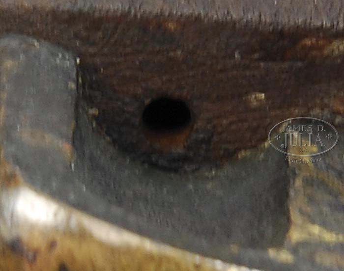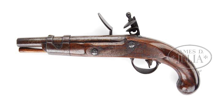 S. NORTH 1816 CONTRACT PISTOL. Cal. 54. 9-1/8″ rnd bbl marked near breech “P” over “US” and “RJ” over touch hole. Lock plate marked underneath brass pan “S. NORTH” over-arc, over “U” spread-winged eagle “S”, over “MIDLN, CON” under-arc. Gun is original flintlock. Bbl tang, butt cap, trigger guard, side plate, lock screws, front band all marked with small triangular punch mark indicating an assembly code. Ramrod appears original with metal ferrule on end. Walnut stock marked opposite lock in script “LS” inside a circle (Luther Sage) below a “V” with “JC” next to it. “3” stamped on left side of stock over butt cap and on right side above butt cap. PROVENANCE: Charles Radcliffe Collection. CONDITION: Remnants of brown lacquer finish on metal have turned to patina and has never been cleaned. Walnut stock in fine condition having never been cleaned or sanded. One small 1/8″ circular area broken away in front of lock and aside from 1/8″ x 1/8″ minor chip at front of lock, there are no major scratches or dents to finish. Gun is overall in fine condition. 4-39587 PAS10 (3,000-4,500)