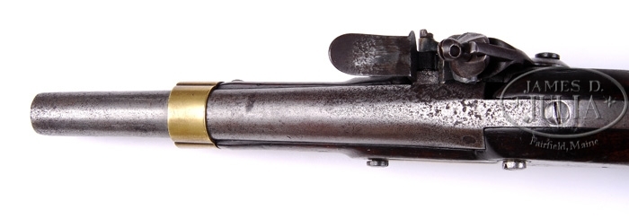 EVANS 1814 MILITIA PISTOL. Cal. 72. 8-7/8″ rnd bbl marked on left breech flat “T” within a sunken oval. Lock marked under brass incline pin “EVANS”. Inside of lockplate marked with an “H”. Walnut stock is unmarked and of proper pattern. Bbl band, side plate, trigger bow and butt tang are all brass with the rear bbl tang strap and trigger guard strap made of iron in the pattern of the French model year XIII (1805). PROVENANCE: Charles Radcliffe Collection. CONDITION: Bbl is in very good condition with medium to heavy pitting around touch hole. Lock mechanism is in very good condition and shows no evidence of pitting as does the balance of the furniture. Stock having a 1/2″ x 1/2″ area burned away behind the right side of the bbl and a small 1/4″ x 1/4″ chip by lock. Stock is in very good condition with no evidence of cracks, splits and dents. Ramrod appears to be original. Smith & Bitter believed there are only about a dozen of these pistols in existence. 4-39583 PAS47 (4,000-5,000)