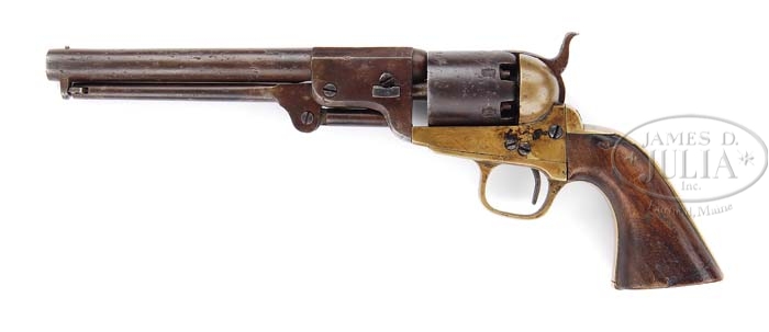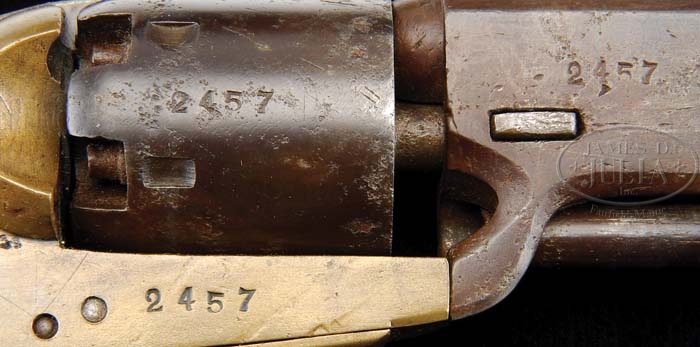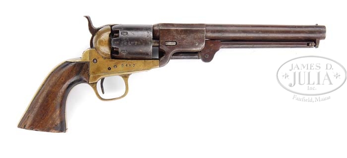 GRISWOLD REVOLVER. SN 2457. Cal. 36. You are bidding on a nice 100% orig Confederate revolver that is listed in William Abaugh’s “Confederate Handguns” on pg 36. This gun has an overall brown aged patina. This gun shows a considerable number of casting flaws that can be seen in photo, not an unusual feature on Griswolds. SN 2457 is found on bbl housing, cylinder and frame. The secondary number “27” is found on loading arm, wedge, hammer, trigger and triggerguard. Walnut grips show considerable shrinkage, but this is not unusual for Griswolds. This is your opportunity to buy a fine second model Griswold revolver that presents beautifully and is a prize in the Edmunds collection. PROVENANCE: Fred Edmunds Collection. CONDITION: As noted above. 4-38129 JS39 (25,000-30,000)