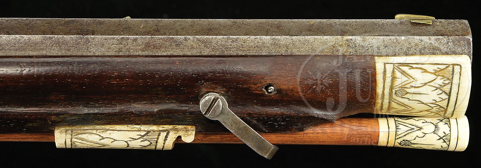 UNUSUAL WHEEL LOCK RIFLE IN THE STYLE OF THE MASTER OF THE ANIMAL HEAD SCROLLS BY GEORGE KEISER IN VIENNA, CIRCA 1660. SN NSN. George Keiser was one of the, if not the, most important Austrian gunsmiths of the late 17th and early 18th centuries. Existing examples from the wheel lock period are scarce. He appears to have carved this rifle in the style of the Meister der Tierkopfranke, however the carving lacks the crispness and fine detail of the Master himself. The dark walnut stock is deeply relief carved cheekpiece, patchbox and side panel while the forend is fluted, but relatively plain. A major motif on cheekpiece of a hunter blowing a horn in pursuit of a deer with a castle in the background. There are six inlays of white stag horn with floral decoration. The plain lock with internal wheel has a finely filed dog spring. Dog is delicately and well pierced and is engraved with a merman on the top jaw. Oct bbl having a two leaf rear sight and brass fore sight. George Keiser’s mark consisting of a crown beneath the initials “GK” is deeply sunk in a bronze reserve on the top flap. A “2” is engraved at the breech. A museum number “P1942 4411 8LD” is inked onto the floorplate. PROVENANCE: See The Gun Report, Vol. 41, No. 12, May, 1996, Cover. Bill Young. Collection of Dr. Douglas Sirkin. CONDITION: Pan cover release is replaced. Cock jaw repaired. Lock plate lightly pitted. Bbl lightly pitted overall. Stock is good with crisp carving and some minor repaired splits along forend. Front ramrod pipe replaced. Sling swivels original and present. 4-49864 (10,000-20,000)