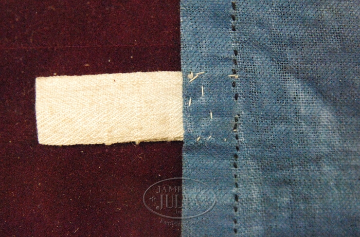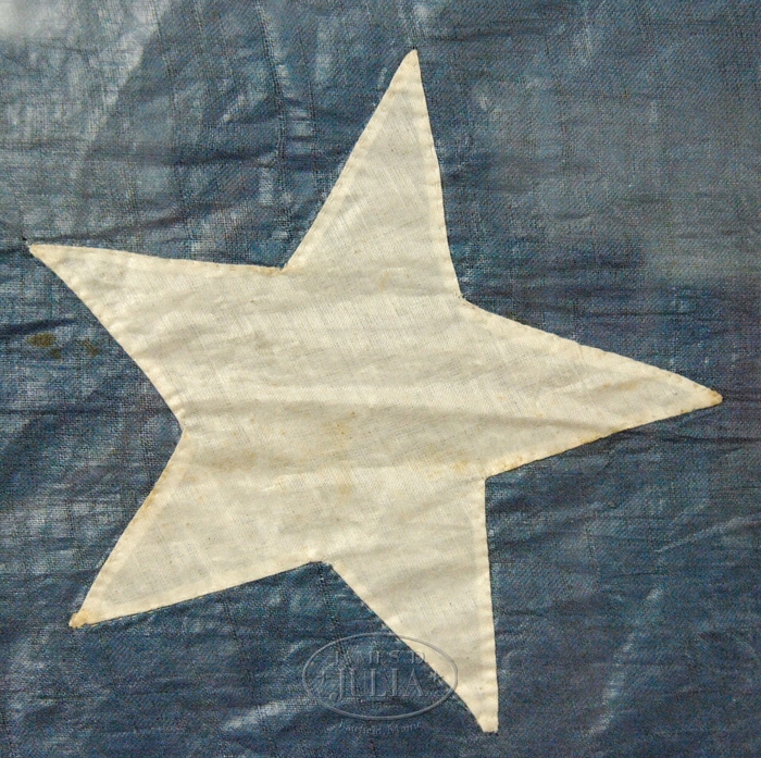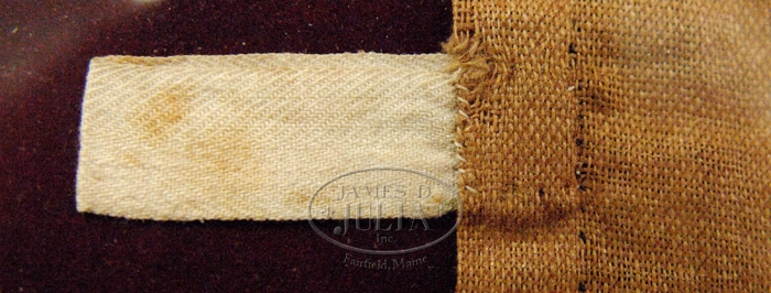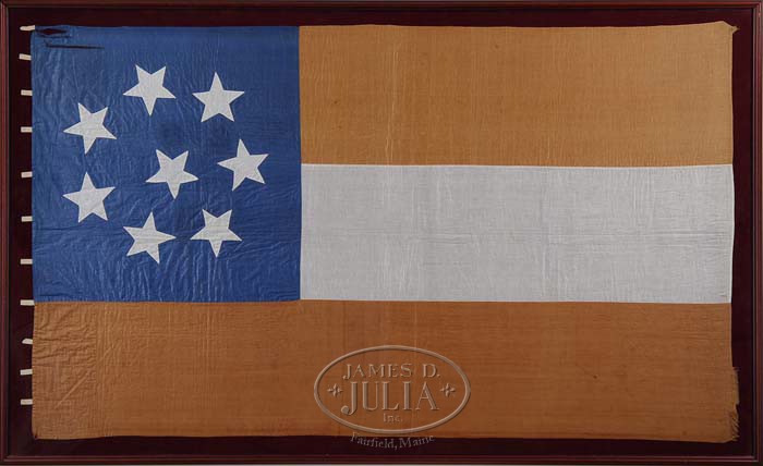 EIGHT STAR CONFEDERATE FIRST NATIONAL FLAG. You are bidding on a beautifully framed 8 star Confederate National flag. This flag is entirely hand sewn with double appliqued cotton stars. The sewers of this flag were quite expert as evidenced by the tightly placed hand stitches. The 8th star represents the state of Virginia. This flag was regulation between April 17 and May 6, 1861, so we can date this flag to that 20 day period, commemorating the entry of Virginia into the newly formed Confederacy. Eight star flags are quite rare. Conversations with the late Howard Madaus confirms less than 10 flags of this pattern. This is a beautiful one. This flag measures 80″ on fly x 46″ high. 11 of 12 loop/ties for pole attachment remain. This flag is made from polished cotton or linen, typical of dress lining material of the era. This type of material was prevalent in early 1861 flags. Another 8 star company flag of the 27th Virginia is also known to be made from similar material. This is a wonderful opportunity to buy a fine framed First National flag made near war’s beginning. CONDITION: Flag overall is in fine condition, as can be seen in photograph. Two tears can be seen in canton and some fraying at fly. Colors are good, especially the blue. The red has light fading, turning it red/brown. 8-76233 JS40 (20,000-30,000)