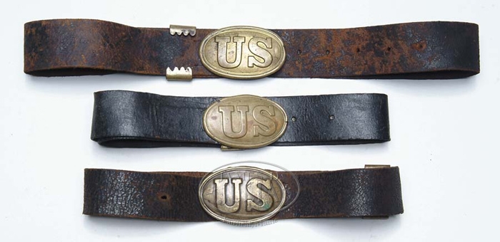 LOT OF 7 CIVIL WAR ENLISTED US INFANTRY BELTS WITH US OVAL BUCKLES. This lot contains 7 lead-filled US buckles attached to orig belts. Five contain attached brass belt keepers. One belt has Portland, Maine maker. Another has a Philadelphia maker. CONDITION: Buckles are all in very good to fine condition with various patinas. Belts are very good overall, though two have tears. 4-56189-7 JS84 (1,500-2,500)