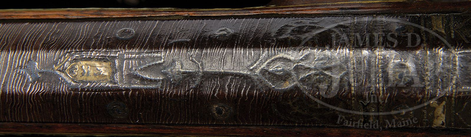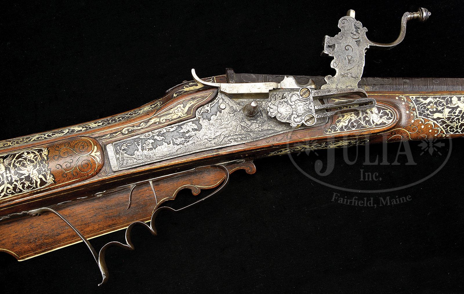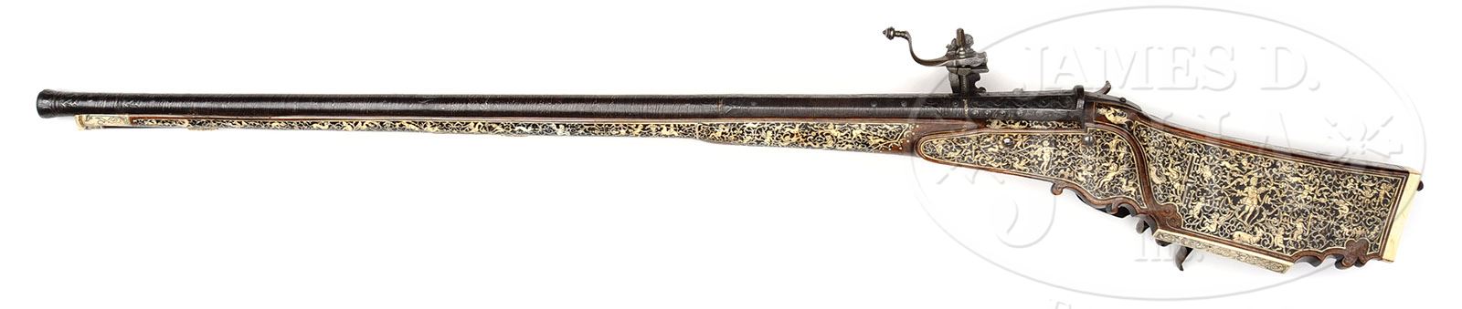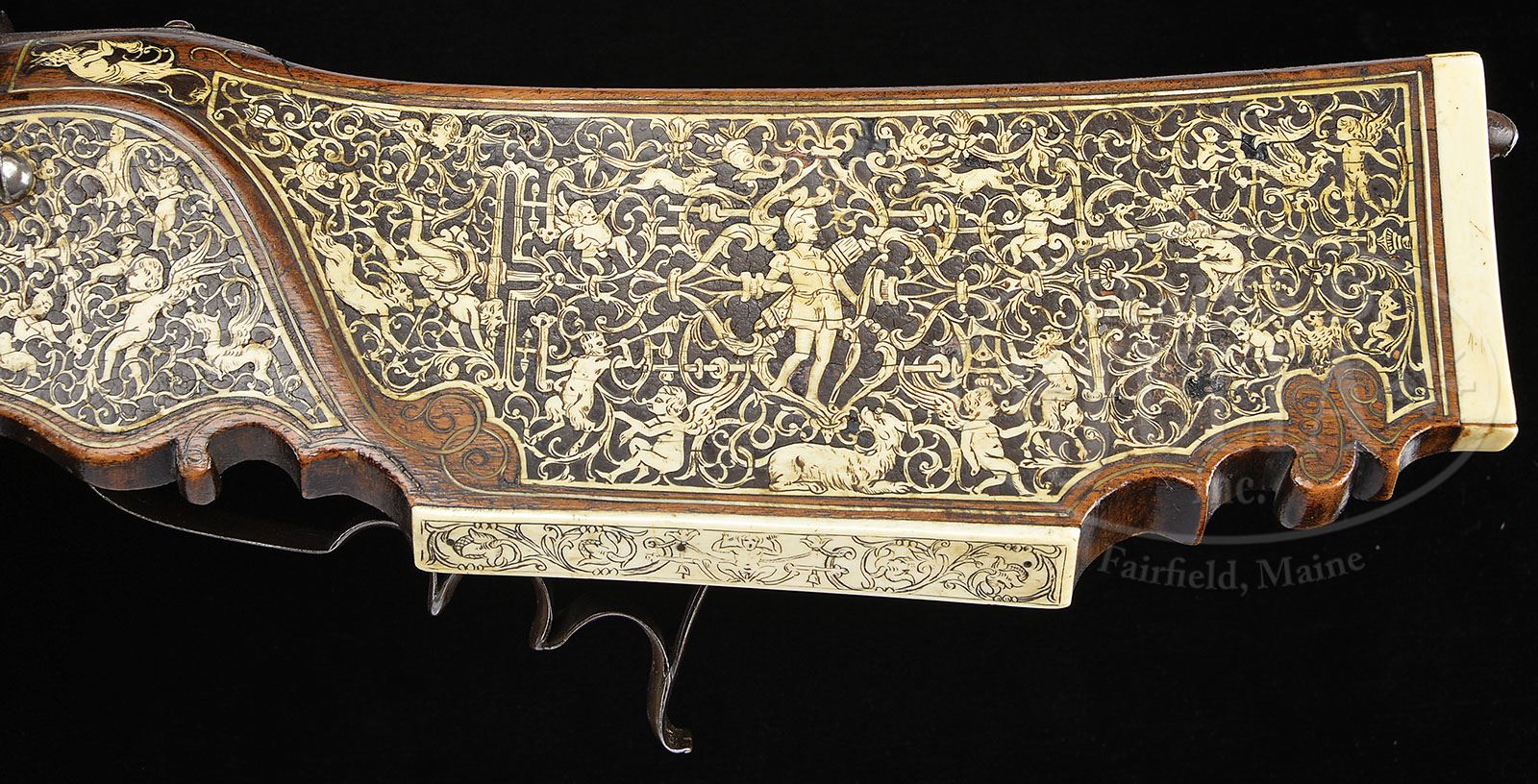 17th CENTURY STYLE NUREMBURG WHEEL LOCK MUSKET WITH LAVISH FIGURAL INLAY. SN NSN. Splendid work of art wheel lock musket mounted with 16th century Ottoman bbl. Bbl of large bore, elaborately inlaid with heavy silver in arabesques and exhibiting superb Damascus pattern. Silver maker’s stamp in recess towards breech. Many German guns were remounted with barrels from Ottoman guns captured at the siege of Vienna. The white stag horn inlay is unusually elaborate throughout butt stock and forend. Depicting fanciful animals, mythological dragons and winged angels blowing trumpets. Cheek piece inlay featuring a Roman hero surrounded by trumpet blowing putti and other figures. Patchbox decorated en suite and is original to gun, featuring angels, goats and satyrs. Lock is relief chiseled and engraved with recumbent figure resting after a hunt. Wheel lock is a piece of art. PROVENANCE: Collection of Clay P. Bedford. See related example James A. Rothschild collection at Waddesdon Manor. Collection of Dr. Douglas Sirkin. CONDITION: Overall good with inlays substantially intact throughout. Scrimshaw on white stag horn inlays still very crisp. Lock slightly worn with replaced pan and pan cover. Double set trigger needs adjustment. Bbl very crisp under old patination. Tang replaced during working life. 4-49769 (15,000-25,000)