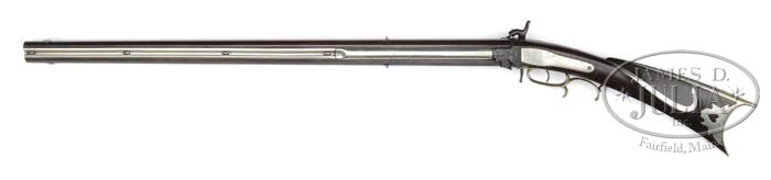 RARE VERY HIGH QUALITY A.S. BISBING SWIVEL BREECH KENTUCKY COMBINATION RIFLE. SN NONE. Cal. 42 Rifle & about 54 Smoothbore. Extraordinary, very high quality, swivel breech percussion rifle with 33-1/4″ superposed oct bbls with dovetailed German silver Rocky Mtn. front sights and fixed rear sights. Both bbls are marked identically on top just back of rear sights “A.S. BISBING” in an arc over “MAKER”. Bbls have a concave solid silver rib on each side that at about 21-1/2″ back from the muzzle transition to about 10-1/4″ convex silver rib. Right side of bbl is mounted with two plain silver guides with the nosepipe as part of the raised convex area, which contains an old replacement hickory ramrod. The breech is octagonal shape with long sides and has a tapered, stepped top tang with two screws. Back action lock is stepped to the rear with rounded tail and a flat sided hammer with Spanner nut. Bbl release is a long lever on the bottom with slightly curled tip through a slot in front tang of trigger guard. Trigger guard is German silver, Kentucky rifle style with dbl finger rests. Buttstock is fantastic tiger maple that has an inlaid false sideplate on the right side, attached with pins and sgl lockplate screw at the tail. Buttstock has a sweeping shallow cheekpiece with a wonderfully engraved snake around entire top edge and the comb of the stock is entirely covered with a tapered, convex, silver plate which mates with the German silver crescent buttplate. The area between the cheekpiece & buttplate is filled with an unusual leaf shaped silver inlay with heart shaped cutout and is nicely engraved in foliate patterns that match the engraving on the false sideplate & convex areas of the bbl ribs. Right side of buttstock is inlaid with a wonderful 4-pc silver patchbox with spring loaded lid with the release button through the silver toeplate that has matching foliate engraving. All four pieces of patchbox are delicately engraved in foliate patterns. Lockplate, trigger guard, top tang and top flats of both bbls are also engraved in fine foliate patterns. Amos S. Bisbing is listed in American Gunsmiths, Sellers, as being in Tannersville, PA in 1861 and White Haven, PA 1870-1890 as a maker of “high quality percussion swivel rifles”. Mr. Bisbing is also listed in Small Arms Makers, Gardner, as being in White Haven, Luzerne County, PA 1868-1870. The census of 1870 shows that he employed one person at $100 per year and that he was equipped with “one boring and one cutting machine”. This is truly an outstanding example of the gun maker’s art suitable for the most discerning collector or museum. CONDITION: Very fine to extremely fine. Bbls retain about all of their strong orig brown finish with a few scattered pin pricks of surface rust. Lockplate & hammer are also a dark brown patina. Stock is sound with a few minor handling & storage nicks & scratches with some staining & dulling by the top tang and otherwise retains about all of its fine orig varnish. Silver is all in fine condition with only one small dent on patchbox lid. Mechanics are fine, strong bores with some shine and light pitting in rifle bbl. 4-40774 JR336 (10,000-15,000)