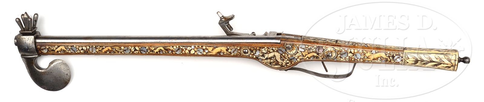 RARE WHEEL LOCK FOKOS, CIRCA 1700. SN NSN. Fokos are normally found with flintlocks. To find one with a wheel lock is unusual and rare. These were not made primarily as weapons, although they could be used as such. they were made to carry in processions as badges of rank and emblems of status in Silesia. This one is of typical form with a long bbl ending in an axe. Lock is of German military type. Axe is unusually well formed with a helmet crusher on the hammer end. Round bbl of typical military form. The fruitwood stock is elaborately inlaid in the Silesian manner with animals and white stag horn, pearl flowers and fabulous monsters. Butt ends in an iron sprue and large stag horn grip. NOTES: An extremely good example of this rare type which belongs in both European collections as well as oddity collections. CONDITION: Overall is fine with few if any inlays replaced and one pearl flower missing. Otherwise inlay is substantially intact and original. Lock has very minor pitting overall but is polished bright. Bbl is polished bright as well. Axe is crisp with only minor pitting on blade surface. 4-49137 MRZ67 (9,000-14,000)