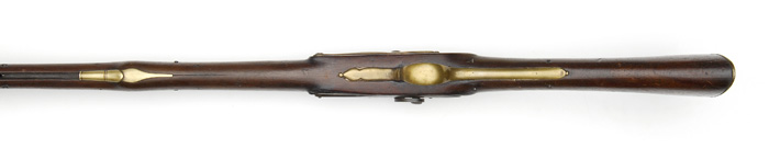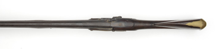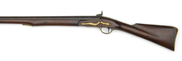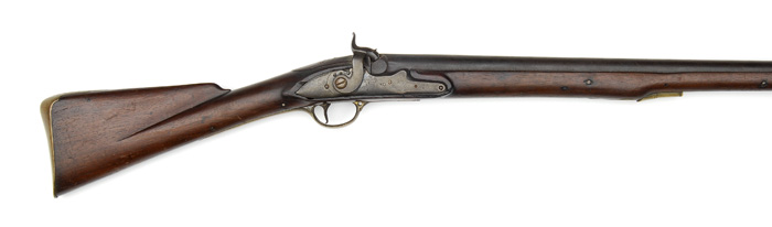GALTON 1ST MODEL BROWN BESS CONVERSION MUSKET. Cal. 80. Early conversion with bbl reduced to 38-1/2″ and converted to percussion. Locklate is marked vertically behind the hammer “GALTON / 1761” and forward of the hammer with a crown over “GR” along with a crown over broad arrow acceptance marks. Mounted in a 1-pc walnut stock with usual brass furniture which includes a brass nosecap, a 4″ flared guide, two bbl shaped guides and a nose pipe. Trigger guard is smooth brass and the sideplate is serpentine shaped with oval cross section and a ball tip on the rear end. Trigger has a small curl in the toe. CONDITION: Fair to good. No orig finish remains with the bbl a very dark brown attic patina with scattered moderate rust. Lockplate & hammer have been cleaned and artificially aged. Brass retains a medium mustard patina. Stock has a crack on the left side near the muzzle with tack holes on one side at the muzzle and is missing both sling wires and ramrod. Mechanics need attention, hammer will not catch in any notch. 4-41118 JR267 (3,000-4,000)