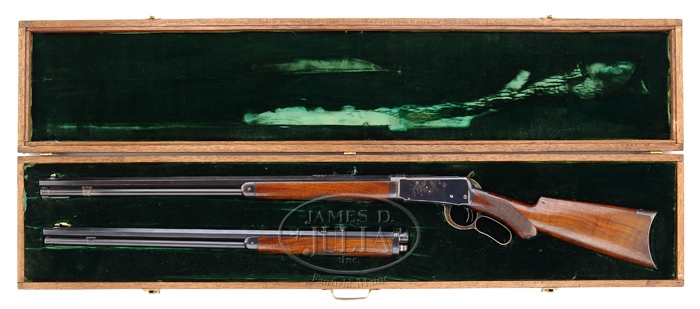 SPECIAL ORDER WINCHESTER MODEL 1894 DELUXE TAKE-DOWN RIFLE. SN 49980. Cal. 38-55 and 30 W.C.F. Rare dlx T/D rifle fitted with two bbls, 26″ oct full magazine with Lyman half-silver front sight and semi-buckhorn sporting rear chambered in .38-55. Second bbl consists of 26″ oct full magazine with Lyman half-silver front sight and Winchester 2-leaf express rear sight. Mounted with semi-fancy American walnut, each bbl having its own forearm, capped pistol grip stock with style “I” checkering pattern, dbl set trigger and crescent buttplate. Lower tang under stock bears assembly number 6591 (CF) as does the buttplate toe and back of buttstock. A Cody Firearms Museum verification sheet confirms the above and states shipped Dec. 19th, 1898 on order 17747. Gun is accompanied by a hand built green velvet lined wooden hard case with brass plaque “Presented to Dr. John W. Conover III by Atlantic City Trapshooting Assoc”. CONDITION: Fine. .38-55 bbl and magazine tube retains 98% blue with some scattered light pitting and associated T/D thinning. Nosecap and T/D ring show areas of flaking and some thinning, retaining 75% finish. Semi-buckhorn rear sight appears to be a replacement and is missing the sight elevator. Bore is bright and shiny with slight scattered pitting at the muzzle. 30 W.C.F. bbl and magazine tube retains 98% of factory finish with only light thinning as produced by operation of the T/D mechanism. Forend cap and T/D ring show evidence of light scattered pitting and retain 95% orig finish. Bore is bright and shiny with slight scattered pitting at the muzzle. Receiver retains 80% blue with some light flaking on the left side and along the high points and sharp edges, balance turning to patina with scattered light pitting. Lever retains 75-80% case color with balance turning to silver and scattered light patina. Hammer retains most of its vivid orig case color with some friction marks on the left side. Buttplate has turned to patina with light to moderate scattered pitting. Wood is sound with normal light to moderate handling marks visible. Mechanics are crisp. Case is structurally sound with moderate scratching, bruising and associated handling wear. Velvet lining has a few small tears, rubs and other blemishes. 4-59759 WD18 (8,000-12,000)