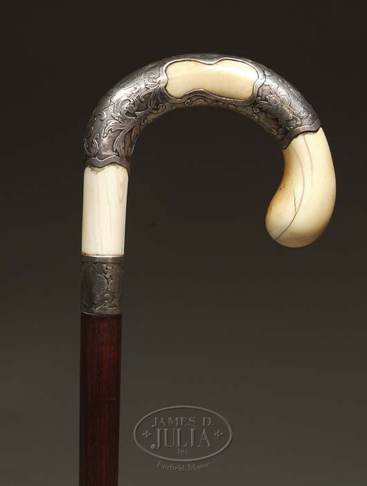 LAVISH IVORY-HANDLED GENTLEMAN’S CANE WITH STERLING SILVER REPOUSSÉ WORK. The curved handle of the cane consisting of Victorian carved ivory on which is mounted scalloped, repoussé sterling silver with floral design. The rosewood-type shaft fitted with a nickel silver tip. SIZE: approx 36” long. CONDITION: Ivory with natural age cracks and the top slightly loose; structurally in fine condition. 4-57666 (350-550)