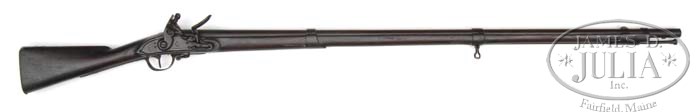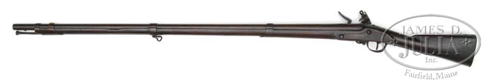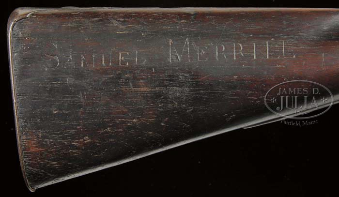 1808 CONTRACT FLINTLOCK MUSKET BY T. FRENCH, BLAKE AND ADAM KINSLEY (CANTON, MASS). SN NSN. Cal. 69. Standard configuration. 44-1/4″ Barrel with bayonet stud at bottom, and “US” eagle head over “CT” cartouche, and “V” at left breech. Lock with integral pan is stamped with eagle over “US” in cartouche, along with “T. FRENCH” in front of cock, and “CANTON” and “1811” on tail of lockplate. Oil finished stock with no visible military markings, is nicely and lightly carved “Samuel Merrill” on right side of butt. CONDITION: Fine. All metal parts are a pleasing smooth mottled chocolate brown, never cleaned. Breech end of bbl is somewhat pitted, touch hole enlarged. Frizzen re-steeled with riveted-on plate. Markings on bbl and lock are clear, mostly sharp, except left wing of eagle. Stock is sound, and retains what appears to be most of its orig finish with some oil rubbed in long ago, with grip and forend nicely highlighted from hand wear. Bbl channel shows one fairly large splinter missing on left side, and one or 2 minor splinters on right. A very fine example. It is believed that the entire contract of 4000 was delivered. 4-45756 MGM164 (2,500-3,500)