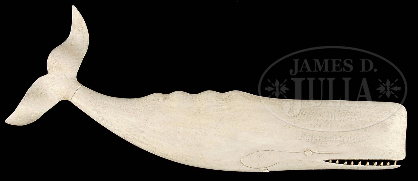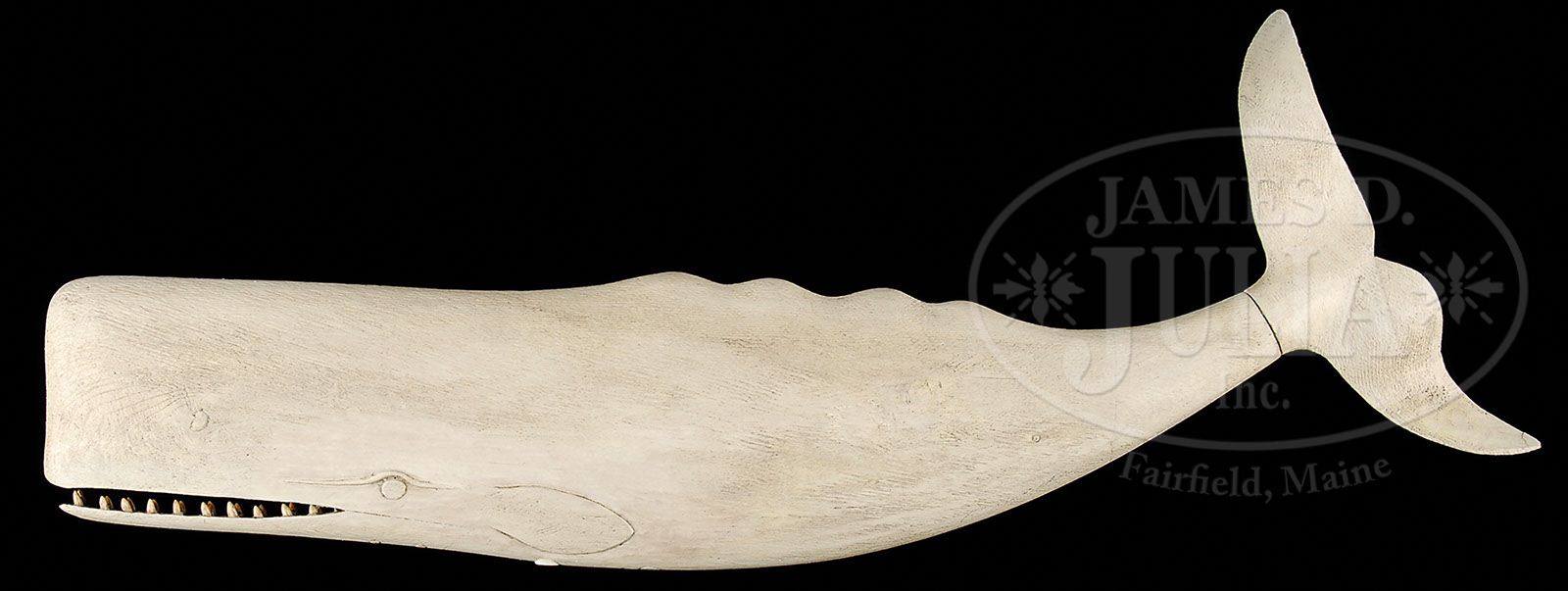 CARVED SPERM WHALE WHIRLIGIG. 20th century, New England. The folk art rendition of a sperm whale with prominent teeth. The shaped fluked tail designed to pivot in the wind. All in cream paint. Mounting rod absent SIZE: 31″ l. CONDITION: Very good. 9-27741 (800-1,200)