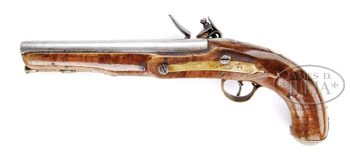 T. FRENCH MASSACHUSETTS MILITIA PISTOL. SN NSN. Cal. 57. 8-5/16″ rnd iron unmarked bbl. Lock marked under pan with very small eagle over “FRENCH”. Behind cock marked “CANTON”. Lock plate marked on bottom with “/||” as is the battery indicating that this gun was produced as part of a larger batch and is original flintlock. Lock has no internal bridle but has a rollerized battery spring, unique for this type of pistol. Opposite the lock nicely marked on the side plate “CANTON” in an arc over “FRENCH” and “MS” indicating Massachusetts. Butt cap, trigger guard, side plate, wrist escutcheon and two ramrod pipes all brass and nicely fitted to the wood indicating this was a well made gun during the 1810-1820 period. Probably intended for a militia unit in the Commonwealth of Massachusetts. Walnut stock is unmarked and has never been cleaned or refinished. Reference page 268 Historic Pistols, The American Martial Flintlock 1760-1845 by Smith and Bitter. PROVENANCE: Charles Radcliffe Collection. Formerly Charles Dupont Collection purchased from Kimball Arms, Woburn, Massachusetts in 1950. CONDITION: All metal appears to be in very good condition having never been cleaned or polished, as is the wood which has only a few scratches and nicks. Overall fine condition gun. Believed to be the only specimen extant. 4-39584 PAS7 (4,000-6,000)
