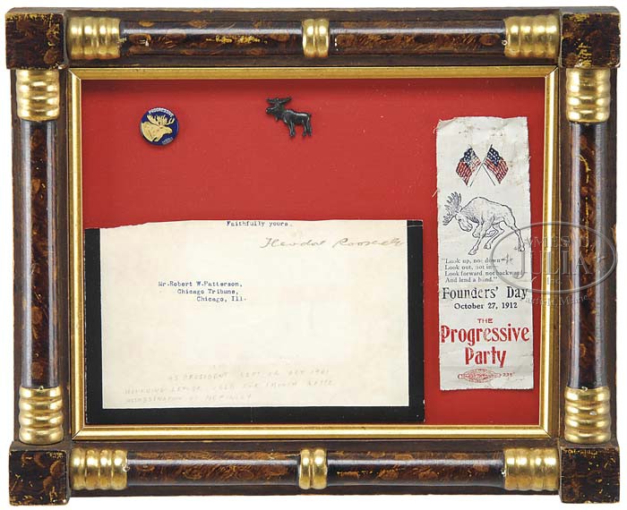 INTERESTING PRESIDENTIAL RELATED MEMORABILIA LOT. 1) 20-1/4″ x 11-1/2″ framed collage presentation having Harry S. Truman First Day Issue envelope, signature of his wife, Bess Truman. Housed in a modern frame with black cutout matte. 2) 17-1/2″ x 10-1/4″ framed, signed, typed letter from Richard Nixon on White House stationary with envelope dated Sept. 13, 1971. 3) 10-1/2″ x 9″ signed photograph “Very Best Wishes to Hon. John Ferguson from his friend Harry Truman”. 4) 10″ x 13″ framed collage of two handkerchiefs, one Smith & Robinson with a donkey, the other Hoover & Curtis with an elephant. Also, signatures of Alfred Smith & Charles Curtis. Included in the collage is a Herbert Hoover medal. 5) 7-1/2″ x 9-1/2″ framed collage including a cut letter with the autograph of Theodore Roosevelt with black border having been used for one month after the assassination of McKinley. A Progressive Party bookmark “Founder’s Day October 27, 1912”. Also a Progressive moose pin. Housed in an antique split column grain painted frame. 6) 6″ x 7″ collage of Nixon pins & medal. 7) 30″ Richard M. Nixon pennant (with some foxing). 8) A red, white & blue “I Like Ike” handkerchief. 9) A small collection of political buttons including Landon Knox; Franklin D. Roosevelt; Fereotype Hannibal Hamlin & Lincoln (damage to both images); and more. A framed transfer on porcelain plaque of McKinley. PROVENANCE: From a coastal New Jersey home. CONDITION: As noted, generally very good. Political buttons show use. 9-24265 (300-500)