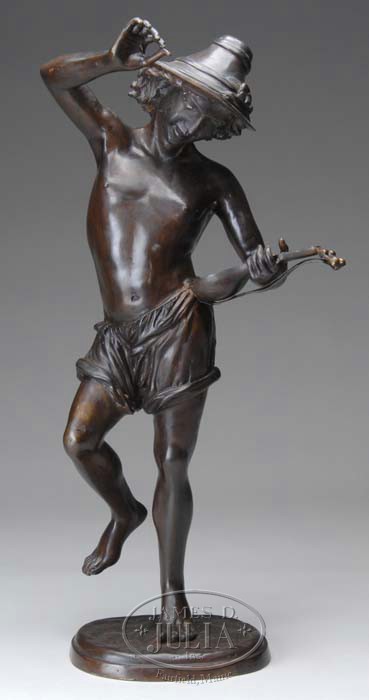 AFTER ALBERT ERNESY CARRIER-BELLEUSE (French, 1824-1887)YOUNG BOY PLAYING MANDOLIN. The bronze statue of a young boy with wide brimmed hat plucking at a mandolin and standing on one leg. The plinth signed, “A. Carrier”. SIZE: 26”h. CONDITION: Roughly cast with scratches on arm and back. 9-74986 (500-1,000)