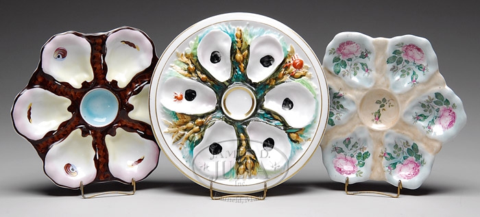 LOT OF SIX OYSTER PLATES. Lot includes: Transfer floral decorated; majolica-form with crabs, shells and seaweed and example of typical form with simulated oysters. Three Continental paint decorated plates with six simulated oysters within a simulated net centering a scallop shell. Mid-late 19th Century. SIZE: Largest: 9-1/2″ diameter. CONDITION: Three showing minor wear and minimal losses to paint. Two in overall very fine condition, one with quarter-inch chip on rim. 9-90989 9-90990 (400-600)