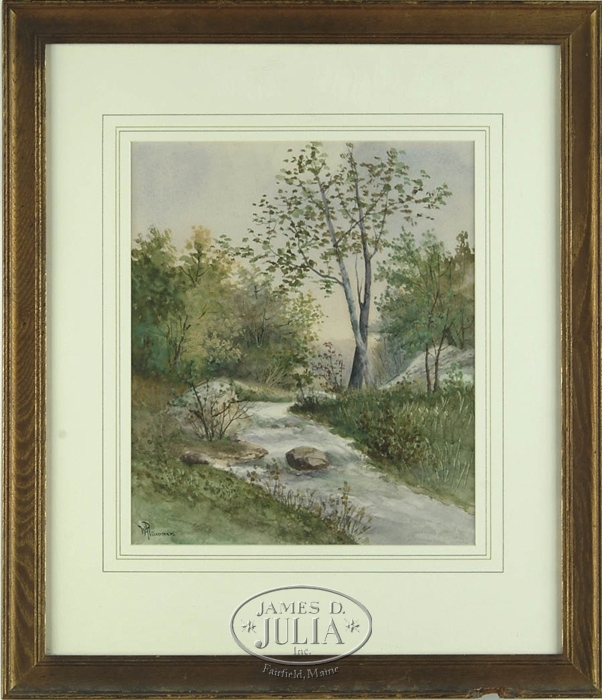 WILLIS HENRY PLUMMER (American, 1839-) FOREST STREAM. Good watercolor scene shows cascading stream lined with trees and grasses. Signed lower left “W H Plummer”. Housed in a gold painted molded wood oak frame with ivory matte having lined highlights. SIGHT SIZE: 13-1/2” x 11-1/2”. CONDITION: Very good. 9-27218 (200-400)
