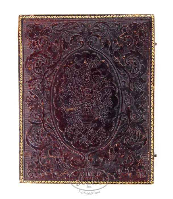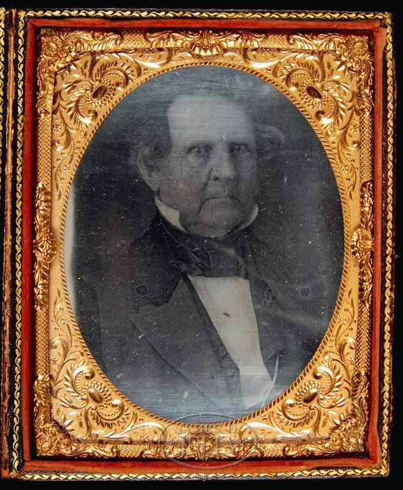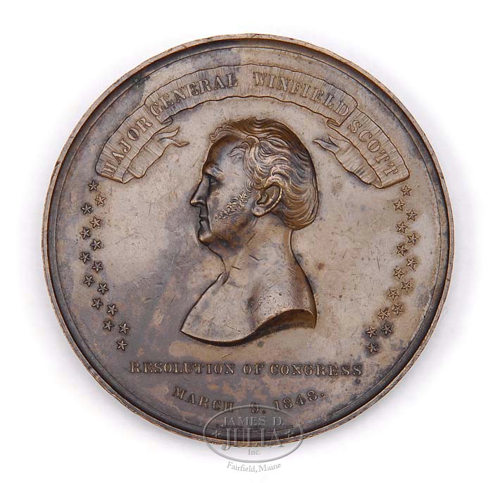 1/2 PLATE DAGUERREOTYPE OF GENERAL WINFIELD SCOTT CIRCA 1850s and WINFIELD SCOTT MILITARY MEDAL FOR CONDUCT DURING MEXICAN WAR 1847-1848. This is an extremely rare photograph of General Winfield Scott taken in early1851, of which only a few similar photos( that were taken at this sitting) are known to exist. This Daguerreotype is a head-and-shoulders portrait revealing a somber Winfield Scott at age 65, dressed in civilian formal attire. Winfield Scott (June 13,1786-May 29 1866), also known as “Old Fuss and Feathers” and affectionately “Grand Old Man of the Army”, holds the record for having served as an active duty general for longer than any other man in American History. During his fifty-year career of serving our country, he commanded forces in the War of 1812, the Mexican American War, the Black Hawk War, the Second Seminole War, and a brief stint in the American Civil War, which he is accredited for the conception of the “Anaconda Plan” which was the Union’s strategy for winning the war. After the victory of the Mexican-American war, he served as military governor of Mexico City. Scott was promoted to Brevet Lieutenant General in 1852 becoming the first American since George Washington to have been honored with this rank and title. Not only was Scott a United States General and diplomat he was a presidential candidate as well. In 1852 the Whig Party nominated him as their candidate rather than their own incumbent and President of the United States, Millard Fillmore. Scott lost the election to Franklin Pierce. The dedication and loyalty of Winfield Scott as a military leader, and his contributions to American History will forever be remembered. Paper seal has been broken. This early daguerreotype photograph is housed in leather covered wooden case with brass frame. This beautiful high relief bronze military medal was originally issued by the congress as a Mexican War conduct medal. Scott personally accepted command of the southern expedition to Mexico. With the cooperation of the navy, he took Vera Cruz early in 1847 then began the long march to Mexico City ending in victory in 1848. On the center front of the medal is a bust of General Scott. over which is a banner with “Major General Winfield Scott” inscribed. At the base of the bust is found “Resolution of Congress/ March 9. 1848”. Engravers name, C. C.(Charles Cushing) Wright, is found on lower right of bust of Scott. The reverse of the medal displays the various, named battle fields of “Vera Cruz, Cerro Gordo, Contreras, San Antonio and Churubusco, Molino del Rey, Chapultepee.” with “City of Mexico” in the center. SIZE: Photograph approximately 4-1/4”x 6-1/2”, case 4-3/4” x 6”. Approximate diameter of medal is 89mm,&9 mm thick, weighs 379grams. CONDITION: Dag has small clear spots on back. Leather case is separated, and repaired and shows very light wear. Medal is excellent, with great even chocolate patina. 4-35457 RMJ2 (20,000-30,000)