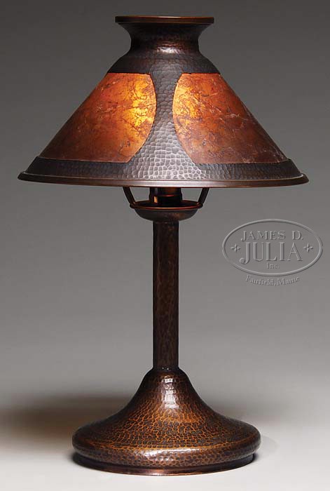 ARTS AND CRAFTS HAMMERED COPPER LAMP WITH MICA SHADE. First quarter 20th century. The conical shade with everted rim mounted with three shaped mica panels. The shade fitted to a candlestick base with a circular fitter ring and acorn pull chain. SIZE: 17″ h, 11-1/8″ d of shade. CONDITION: Retains original mica panels. The lamp with very nice dark brown patina. One mica panel with damage at mounting flange. Otherwise very good. 9-98386 (300-500)