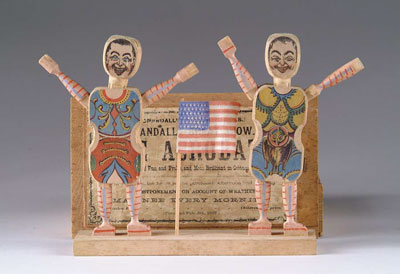 EARLY CRANDALL ACROBAT SET. Pat. 1867. Boxed wooden set shows four acrobat figures with lithographed paper graphics. Removable arms and legs of figures are hand painted. SIZE: Rabbit jointed box measures 6” x 10”. CONDITION: Box is full though not guaranteed complete. Contents averages very good. 1-1972 WP (150-300) Auction: Advertising, Toy & Doll - Spring 2004 Please Note: All prices include the hammer price plus the buyer’s premium, which is paid by the buyer as part of the purchase price. The prices noted here after the auction are considered unofficial and do not become official until after the 46th day. |