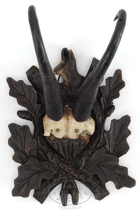 COLLECTION OF MOUNTAIN GOAT AND DEER ANTLERS ON CARVED WOOD MOUNTS. 19th century, Bavaria and Switzerland. Collection of 19 mountain goat and deer antlers all on carved walnut or ebonized Victorian mounts in various sizes and colors. SIZE: Varies from 5″ h to 9″ h. PROVENANCE: From the “Harp House” of Camden, Maine. CONDITION: Generally very good. 9-26839, 9-26857 (300-500)