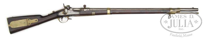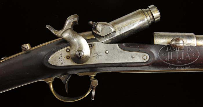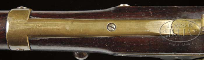 RARE LINDER BREECH LOADING PERCUSSION CONVERSION MISSISSIPPI RIFLE. Cal .54, 33″ bbl. This very scarce alteration which was done at onset of the Civil War by Allen & Morse of Boston, MA. This firm had a contract from the state of Massachusetts for 100 guns and this gun is stamped “NR42” which is possibly the 42nd gun altered. All guns altered in this contract were specimens produced by Robbins & Lawrence of Windsor, VT. The alteration consisted of removing a rear section of bbl forward of breech and replacing it with a rotating sleeve of Linder’s patent which would now attach to the newly machined breech with the orig bolster & nipple from orig configuration that now pivots to accept a combustible cartridge. The orig tang is replaced by a stronger & heavier brass plate and a heavy brass floor plate is also added forward of trigger guard at base of stock. The rotating sleeve is marked “PATENTED MAR 29 1859”. Gun still retains typical orig Robbins & Lawrence and bbl & stock inspector marks as found when gun was made in 1848. The newly added reinforced plate that replaced tang is fit for an adjustable tang sight which is not present. This alteration also added an iron front sight that would also act as a bayonet stud. This is a very nice example of this alteration that would be difficult to upgrade. CONDITION: Gun is very good to fine overall. Metal surfaces are all gray/white with scattered staining & pitting. Bore shows well-defined rifling. All markings are crisp & discernible. Brass hardware has yellow patina. Stock is sound & solid with scattered storage dings & scratches. 4-45738 JS71 (6,000-8,000)