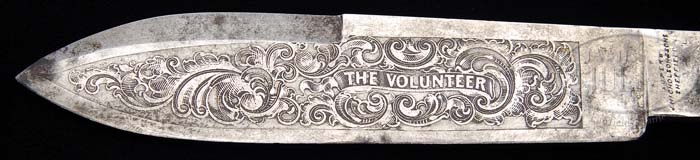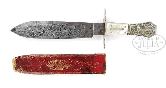 HALF HORSE/HALF ALLIGATOR BOWIE KNIFE. You are bidding on a Sheffield Bowie that is 12″ overall with 7-3/4″ blade made by J. Nicholson & Sons. The half horse/half alligator that is found in the pommel is a popular American motif where many frontiersmen deemed themselves as tough as this allegorical figure. This knife is in wonderful condition, as can be seen in photo, with a beautifully etched blade which says “The Volunteer”. The accompanying scabbard is gold embossed with an eagle and two flying horses and reads on both sides “The Real California Gold Finder Knife”. CONDITION: Knife overall is very good, blade is gray with good etched panels with traces of the orig gold wash, as can be seen in photo. Mother of Pearl slabs on top. Half horse/half alligator pommel is good with just minor scuffing. Accompanying scabbard is about 8″ long but has probably lost 1″ or so of its tip, is missing drag and orig metal throat. 4-38919 (25,000-30,000)