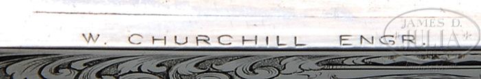 EXTRAORDINARILY RARE WINSTON CHURCHILL ENGRAVED CASED PRESENTATION QUALITY MORSETH HUNTING KNIFE. Morseth knives, in and of themselves, are somewhat rare. Mr. Morseth invented a special method of making his knives with a special hardened edge forged into a softer steel blade making his blades substantially more flexible with an extremely durable edge. This knife has a 4-1/4″ skinning blade with a sgl German silver handguard and dbl stag handle with stag pommel. What sets this knife into another realm is the fantastic engraving by world class master engraver, Winston Churchill. Engraving consists of beautiful foliate arabesque patterns along both sides of top edge of the blade and ricasso. Right side of the blade is also engraved with a small panel of a branch with several clusters of pine needles. Sides of handguard are engraved in a chain pattern and the pommel cap screw is engraved in a flower blossom. Spine of the blade, near the handguard is engraved “W. CHURCHILL ENGR.” The stag handle is wonderfully scrimshawed on both sides of the handguard section with a Big Horn sheep on left side and a Dall Sheep on right side with a pine branch on the top. Left side of the handle body is beautifully scrimshawed in foliate arabesque patterns and the top of the pommel cap is equally beautifully scrimmed with the head of a Rocky Mountain goat ram. Accompanied by its orig burgundy velvet lined walnut casing with fine alligator skin covered top & bottom. Bottom of interior is French fitted for the knife. Front of case has a mortised brass latch. CONDITION: Extraordinarily fine, new & unused, unsharpened. Pommel cap has a hairline above the screwhole, parallel with the tang. Case is equally new. 4-46769 JR372 (10,000-15,000)