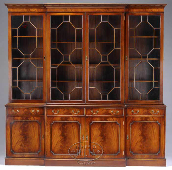 LARGE TWO PART MAHOGANY BREAKFRONT. Last half of the 20th Century. Reproduction, made in England. The top part having gentle molded cornice, four glazed doors, having adjustable shelves behind. The bottom section having four drawers fitted with brass handles over four doors, having shelves behind. All raised on a molded edged base. SIZE: 87”h x 87” at widest x 17-1/2” maximum depth. CONDITION: Very good to excellent. 9-73927 (1,500-2,500)