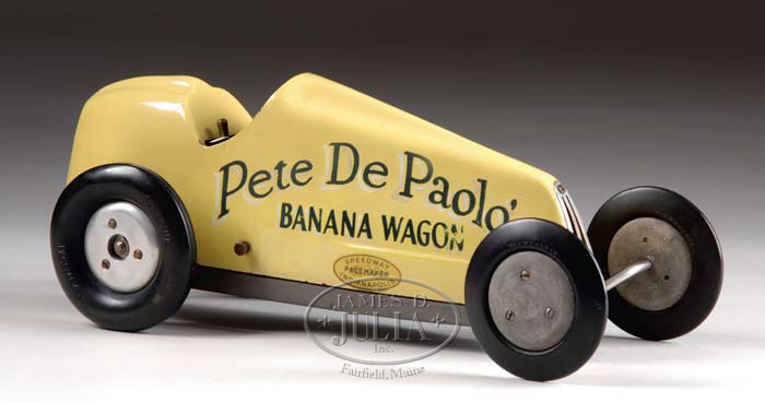 BANANA WAGON SPEEDWAY PACEMAKER GAS POWERED RACER. Made specifically for the renowned Peter DePaolo, presented to him by the factory in 1951. DePaolo’s cars were always yellow in color, always numbered “12”, and always known as “Banana Wagons”. Powered by a .60 Hornet engine. The lot includes a letter of provenance from DePaolo’s son Tom confirming that this racer was given to his father Peter and was in his collection for many years. SIZE: 17″ l. CONDITION: Some minor crazing and paint chips around graphics, wear to hubs, small corner cracks to paint at seat corners. Overall very good to near excellent. 1-7642 (2,500-3,500) Auction: Advertising, Toy & Doll - Spring 2007 Please Note: All prices include the hammer price plus the buyer’s premium, which is paid by the buyer as part of the purchase price. The prices noted here after the auction are considered unofficial and do not become official until after the 46th day. |