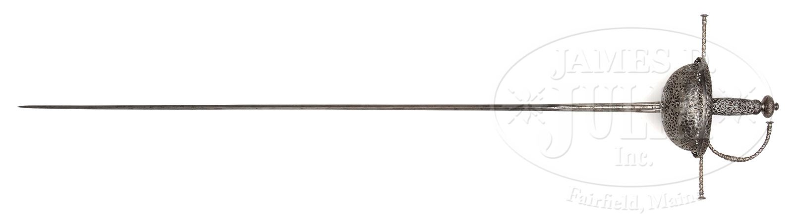 FINE ITALIAN CUPHILT RAPIER, SUBSTANTIALLY 17TH CENTURY FROM METROPOLITAN MUSEUM COLL. SN NSN. Cup elaborately pierced in the Brescian manner with monsters, birds and flowers. Guardapolvo pierced en suite and intact. Guard and quillions of writhen steel. Pierced grip and steel Turk’s heads. Solid pommel chiseled with flowers en suite with guard. Long lozenge-shaped blade with short fullers marked Solingen. Balance is perfect. An extremely similar example, possibly this very piece is illustrated in Stone’s glossary under the rapier heading. Deaccessioned from the Metropolitan Museum of Art, New York City, sold at Parke Bernet Galleries, New York, 1956. PROVENANCE: The Metropolitan Museum of Art, New York City. CONDITION: Overall very crisp for an all steel sword of this period and type. 4-49158 MRZ71 (6,000-8,000)