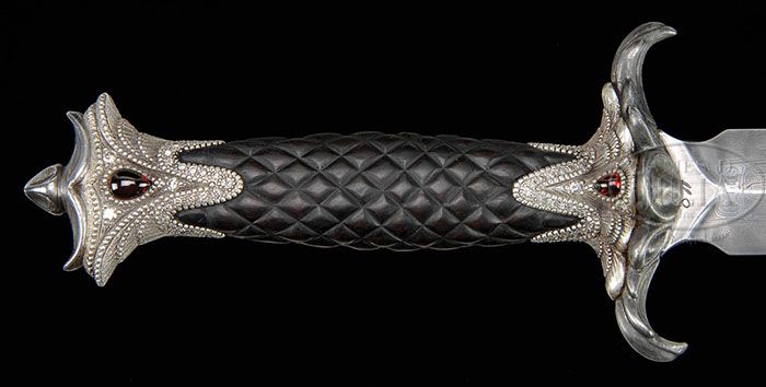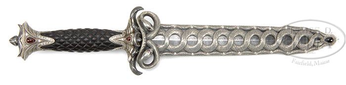 INCREDIBLE AMERRUSS BLADE ART SERPENT DAGGER WITH SCABBARD AND CASE. SN NSN. This exceptionally fine handmade creation by this design studio (AmeRRuss), founded by artisan Joseph Shnayder and bladesmith, J. D. Smith, combines shimmering, intricately patterned 7-3/4″ full tang Damascus double edged blade with intricately filed and shaped Damascus crossguard in jewel encrusted (diamond and garnet) silver mounts, with carved diamond patterned African blackwood grip. Heavy solid silver handwrought scabbard of interlaced sculpted serpents with pairs on each side having heads emblazoned with sparkling ruby eyes. Acanthus engraved blade guards are diamond studded. Teardrop shaped garnets are at tip. Materials used, as listed by the makers, include Blade: 15N20, 1084 steels, and modified “Turkish ribbon” core, high density “WS” edges. Silver: 350 grams/ 11.29 oz. Rubies: 8 round faceted 0.64 carats total. Diamonds: 159 round brilliant 6.43 carats total. Garnets: 6 pear-shaped Mozambique cabochon. Handle: African blackwood. This fine creation is housed in red velvet, satin and tan, leather-lined case. CONDITION: Excellent, essentially as new. One-of-a-Kind! 4-46357 MGM278 (10,000-20,000)
