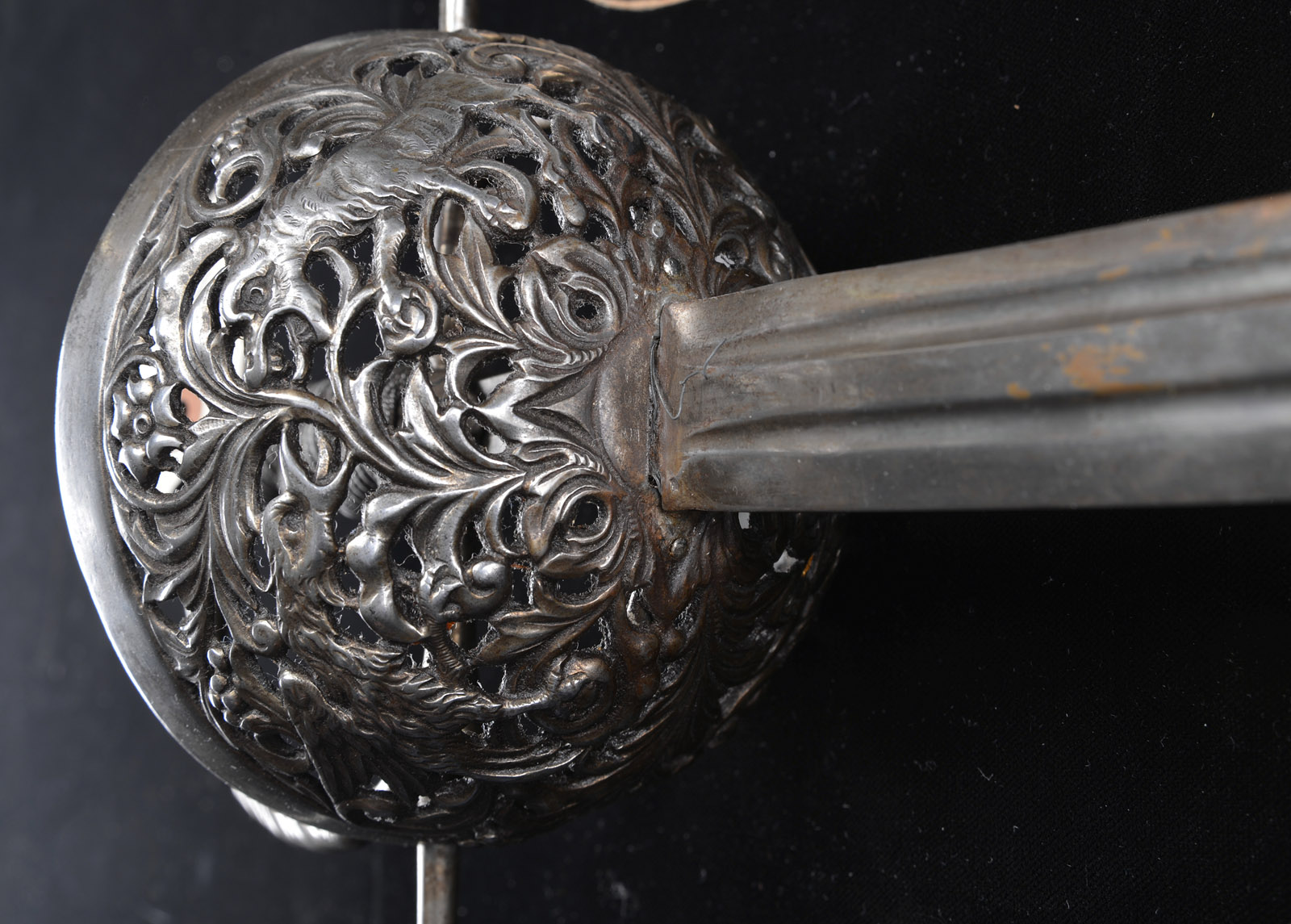 LOT OF TWO FINE ANTIQUE EUROPEAN SWORDS. SN NSN. Group consists of a finely cast and chiseled transition rapier possibly Dutch circa 1640 with fine pierced blade and three fullers. The guard cast and shaped in relief with human figures as well as angles and fawns. A hilt chiseled with a horse and rider and pommel is chiseled with grotesque masks. Grip finely bound in copper chain with copper Turk’s heads. The cup hilt rapier comprehensively 19th century cup cast and pieced with dogs and winged monsters, pommel with acanthus leaves spirally wire bound grip and hilt of characteristic D-guard form with long extended quillions. CONDITION: Generally fine throughout. 4-49157, 49159 MRZ78 (3,000-6,000)
