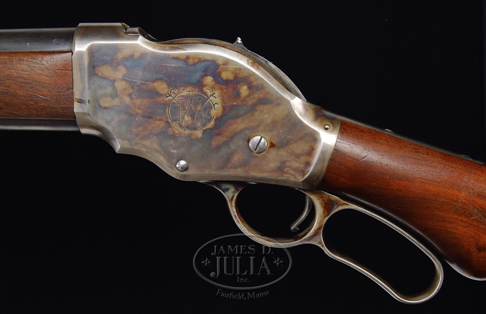 OUTSTANDING WINCHESTER MODEL 1887 LEVER ACTION SHOTGUN SN 49860. Cal. 12 ga. 30″ bbl with modified choke, single sighting bead. Mounted with standard rounded pistol grip stock with 13″ length of pull over Winchester steel buttplate. Manufactured in 1893. CONDITION: Fine. Retains 85-90% blueing on bbl and magazine tube with thinning on bottom of mag tube from carrying. Just a few of the usual handling and hunting marks. Receiver is case colored with the scripted “WRA” on left side and retains 90% of its original fading case colors. Wood is sound with 50-60% of original flaking varnish with slight moisture discoloration at peak of buttplate and the usual handling and storage marks. Mechanics are crisp. Bore is good with moderate light pitting just forward of chamber. 4-33531 BT6 (3,500-5,000)