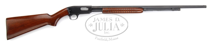 *RARE WINCHESTER MODEL 61 SMOOTHBORE PUMP ACTION RIFLE. SN 51626. Cal. 22 LR Shot. Rare smoothbore 61 with 24″ rnd bbl, brass bead front sight, no provision for a rear sight and a matted, grooved receiver top. The bbl is marked “-FOR SHOT ONLY-”. Mounted with straight grain, uncheckered American walnut with flat bottom, ribbed large forearm and pistol grip stock with checkered steel buttplate. Fine little gun for keeping your skeet & bird shooting eye in practice in the off season. CONDITION: Fine to very fine. Bbl and magazine tube retain most of their original blue with the bbl turned slightly dull. Receiver retains about 93-95% bright blue with edge wear and a few scattered pinpoints of fine rust. Wood is sound with minor nicks & scratches and retains most of its orig factory finish. 4-32878 JR147 (4,500-5,500)
