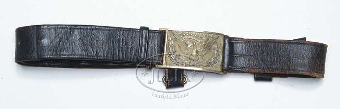 US CIVIL WAR OFFICER’S BELT. Patent leather belt missing hangers. Buckles are high grade with matching benchmarks. CONDITION: Buckle retains over 50% orig gilt. Little wear. Very detailed feathering to wings. Patent leather belt is separated in places, crazed and has loss of finish. 4-56181 JS111 (400-800)