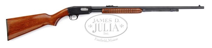 *FINE WINCHESTER MODEL 61 PUMP ACTION RIFLE. SN 259339. Cal. 22. Standard 61 with 24″ rnd bbl, silver bead front sight, and sheet metal rear sight with grooved top receiver. Mounted with nicely figured, uncheckered American walnut with flat-bottom grooved forearm and pistol grip stock with Winchester hard rubber buttplate. CONDITION: Very fine. Metal retains 98-99% strong orig blue with a few small, scattered spots of flaking on receiver. Wood is sound with minor handling and storage marks and retains most of a professionally restored finish. Mechanics are fine. Bright, shiny bore. 4-32877 JR148 (700-1,000)