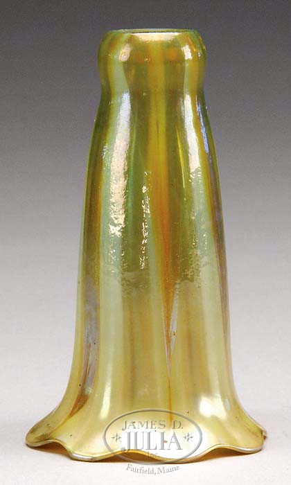 TIFFANY STUDIOS LILY SHADE. Beautiful Tiffany lily shade has slightly opalescent cream ribbons running vertically up the shade. The ribbons are set against a greenish-amber slightly iridescent background while the interior of the shade has gold iridescence with nice pink and blue highlights. Signed on edge of fitter “L.C.T.”. SIZE: 4-1/4″ t. CONDITION: Very good to excellent with tiny fleabite to fitter. 5-68643 (1,800-2,200)