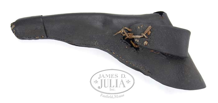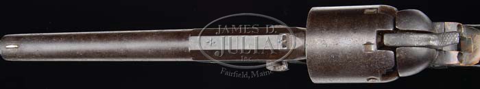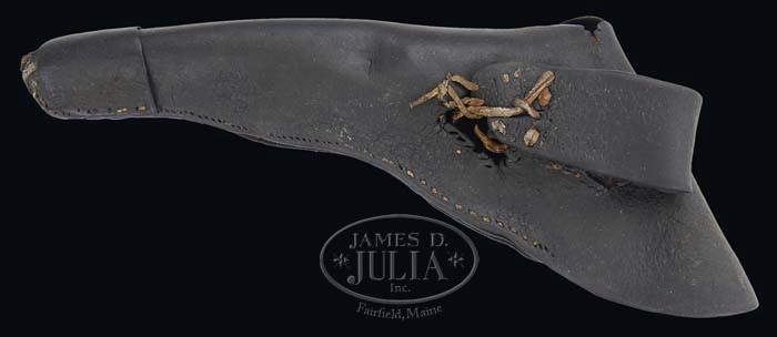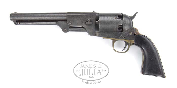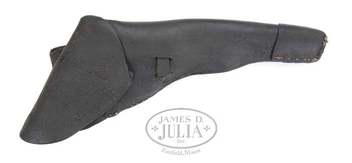 CONFEDERATE DANCE DRAGOON REVOLVER AND HOLSTER. Cal. 44. You are bidding on one of only two Dance Army revolvers with recoil fields authenticated by Gary Wiggins, author of the definitive book on Dance, “Dance & Brothers, Texas Gunmakers of the Confederacy”. There is no doubt in this cataloger’s mind that this is an early Confederate revolver, possibly made by Dance or some other small Texas factory mimicking Dance’s work. Surfaces of gun are consistent with other known Dance revolvers or Tucker and Sherrard revolvers. This gun appears original and authentic throughout. This gun has been in several prominent collections. Letters from these collectors accompany gun and are available to perspective bidders. One letter states the gun originated in Refugio, Texas, from the Carlson family who had an ancestor who fought in the Civil War. The last owner describes the gun as follows, “This very early Dance .44 Army revolver with its original holster came from a well known Texas collector. It is accompanied by a letter from this collector stating the gun’s provenance, ie., from a family whose ancestor fought in the Civil War. This Dance has been authenticated by experts as a product of the Dance factory. It is authenticated by Gary Wiggins, researcher of the Dance factory and its revolvers and author of the book, “Dance & Brothers Texas Gunmakers of the Confederacy”. This Dance revolver has no serial numbers. This is not unusual for Dance revolvers. Some have been observed with diamonds in place of numbers. One Dance with recoil shields and dovetailed rear sight into top of barrel, and with hammer nose not slotted for sighting, as with this particular gun, is stamped “JB” on the bottom of the grip strap. It has no serial numbers. It has an octagonal barrel, which is just one of the many variations found with Dances. (Refer to Bill Gary’s book and chapter on Dance revolvers for listing of variations “Confederate Revolvers” by Wm. Gary.) Overall patina on this gun is a dark brown. Some fine pitting evident on portions of barrel, loading lever and cylinder. Two nipples are chipped. Brass backstrap and trigger guard have a nice aged patina. Wood grips are very good. Mechanically very good. The holster shows reinforcement around the muzzle area and the belt loop has been reinforced. Overall a very sound holster form fitted to this gun.” CONDITION: As described above. 4-35346 JS27 (25,000-35,000)