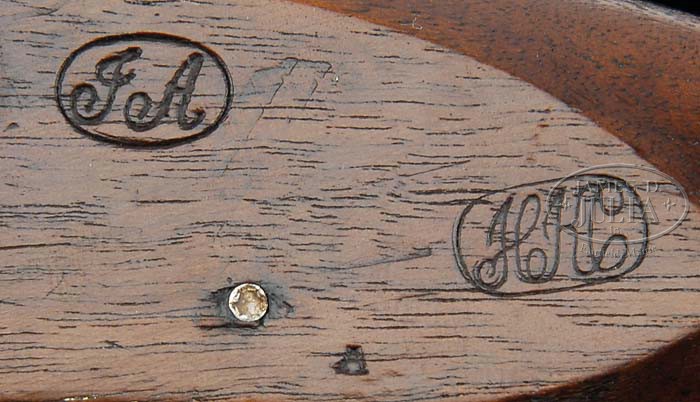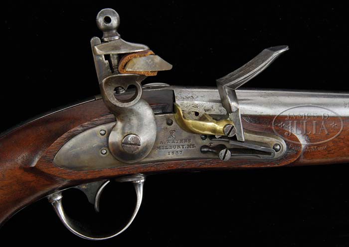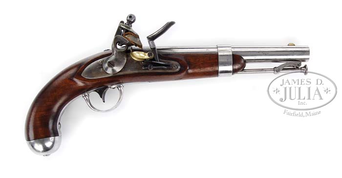 MODEL 1836 A. WATERS ORIGINAL FLINT US MARTIAL PISTOL. SN NSN. Cal. 54. 8-1/2″ rnd bbl marked at breech “U.S./JCS” (John C. Stebbins) and subinspector “A” on left bbl flat. Lock marked underneath brass pan “U.S./A.WATERS/MILBURY. MS./1837”. Triggerguard stamped with sub-inspector “U” and bottom of brass pan struck with sub-inspector “A”. Side plate also struck with sub-inspector “U”. Walnut stock marked opposite the lock with inspector’s script “JA” (John Avis) and a script “HKC” (Henry Knox Craig). The orig flint case hardened blued lock is stamped with the “eagle head”, and “A. Waters / Millbury . MS. 1837”. This was the last US martial pistol produced in the flintlock ignition system and was the standard issue hand gun of the Mexican War. CONDITION: Excellent. Showing very light overall wear. Stock remains in near excellent orig condition with extremely sharp edges and showing only light dings and impressions. All Inspector marks, proof marks and lock markings are very crisp and clear. Iron furniture shows nice even patina overall and stock finish is excellent. Bore is clean. The iron parts are bright with only light pitting and with a few minor vice mark dings in the barrel at the breech and in the front finial of the trigger guard. Pistol appears unfired. It would be difficult to locate a better example. 4-40043 RG17 (3,500-4,500)
