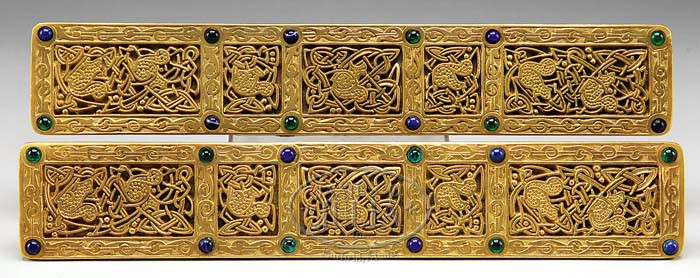 TIFFANY STUDIOS 9TH CENTURY BLOTTER ENDS. Gold blotter ends having deeply recessed 9th Century pattern overall with green and blue jewels. Signed on underside “Tiffany Studios New York 1623”. SIZE: 12″ l. CONDITION: Very good to excellent with several replacement jewels. 5-67254 (1,000-1,500)
