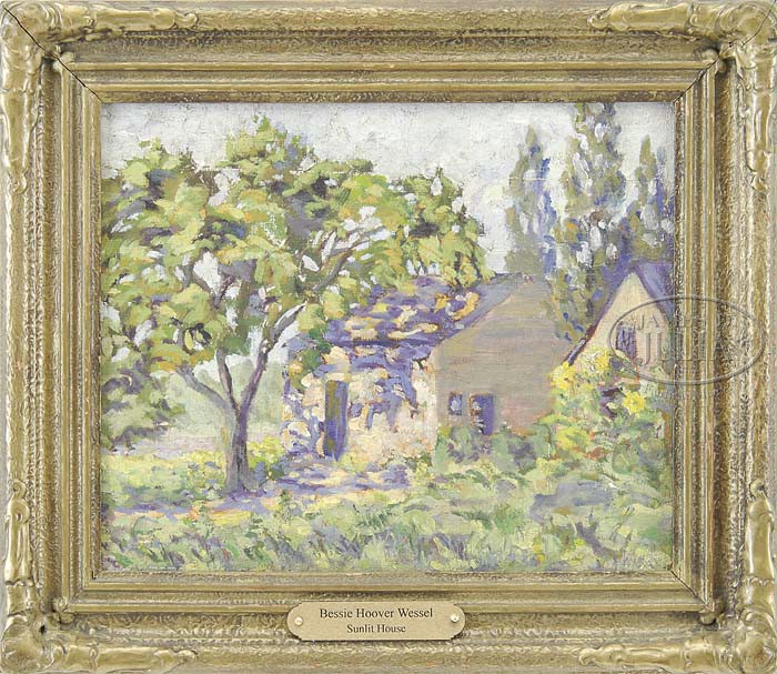 ATTRIBUTED TO BESSIE HOOVER WESSEL (American, 1889-1973) SHADOWS ON THE ROOF. Unsigned oil on canvas mounted to board landscape scene shows a large tree casting shadows over a barn with house beside. Tall sunflowers are beside the house, all under a blue sky. Housed in a period gesso decorated gilt frame having a modern artist plaque. SIZE: 9-3/4″ x 11-3/4″. CONDITION: Very good. 9-21616 (800-1,200)